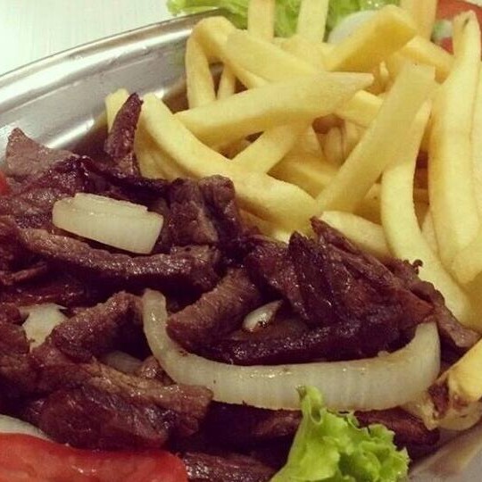 Fife de boi suculento e acebolado, arroz branco, macarrão,feijão, batata frita e salada
