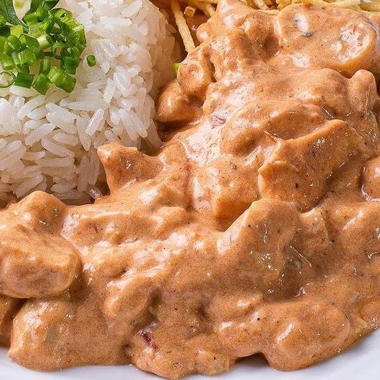 Delicioso strogonoff composto com: Arroz branco, molho especial( frango, milho, azeitona) e batata palha