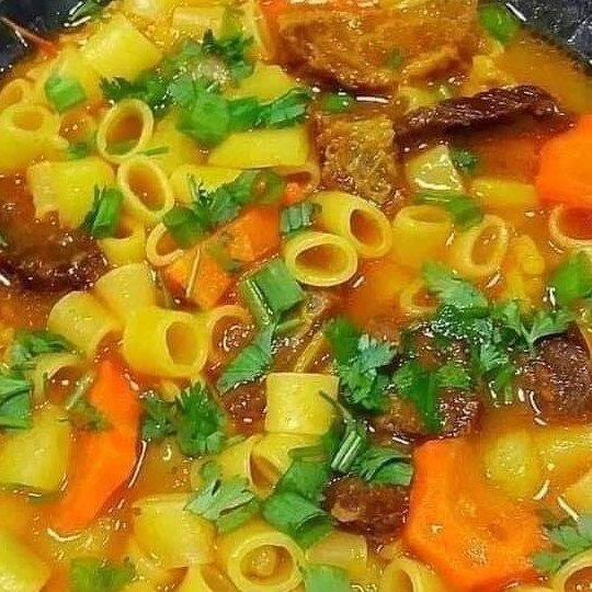 Saborosa e suculenta sopa de legumes com aproximadamente 700 gramas. Composta com cenoura, repolho, batata,moranga, macarrão e iscas de carne bovina.
