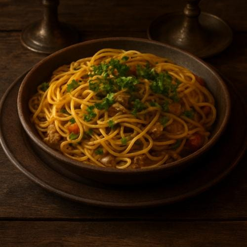 Macarrão, bacon, cebola, linguiça calabresa, pimentão (verde, vermelho, amarelo), molho shoyo ou molho inglês, filé de boi ou porco ou frango picadinho. salada de acompanhamento e brinde gelatina ou mousse (sabores aleatórios)