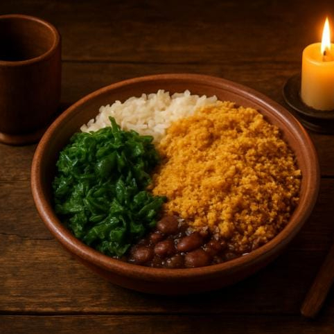 Feijão, bacon, cebola, liguiça calabresa, ovos mexidos, farofa, couve ou repolho ou taioba ou mostarda ou acelga (a falta do ingrediente principal substituimos por outro devido a alta demanda) e ovo frito - 750gr