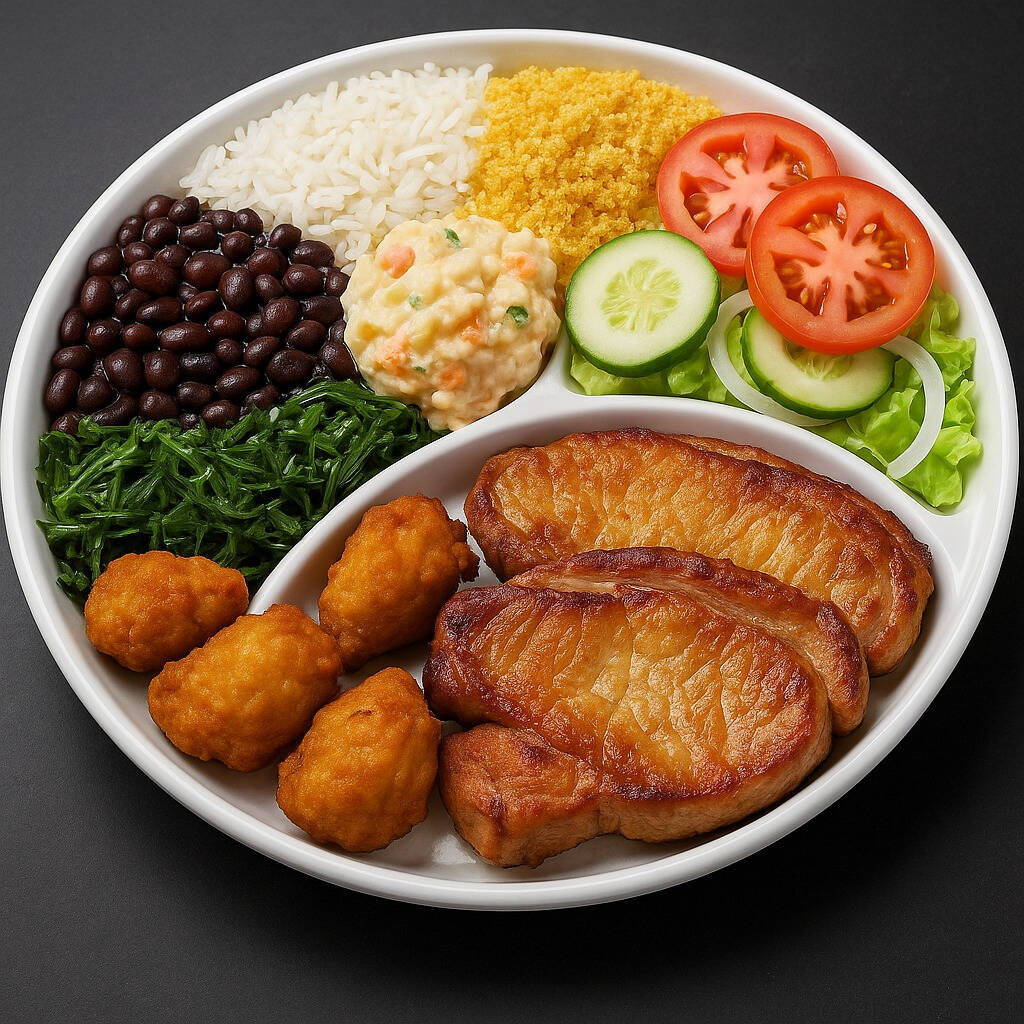 Arroz comum, couve, farofa, vinagrete e a feijoada