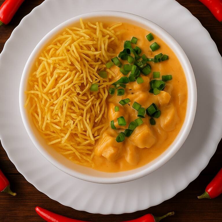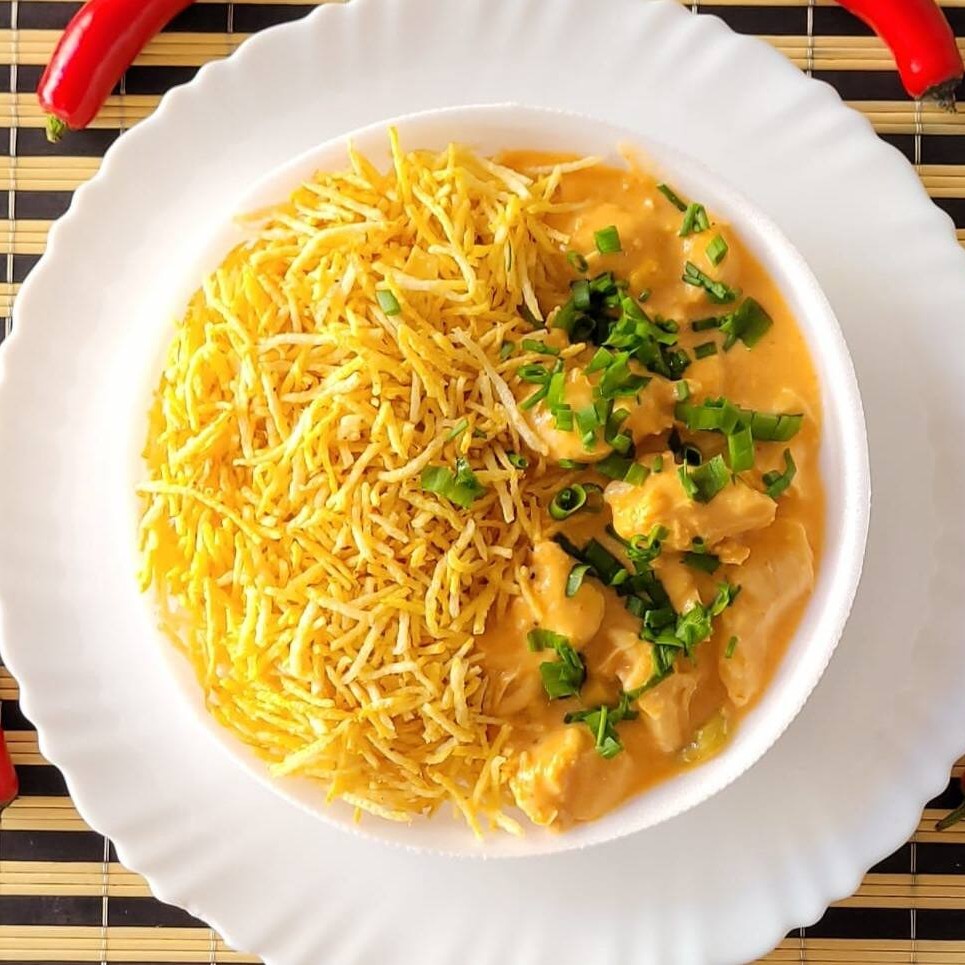 Strogonoff de frango com arroz soltinho, batata palha crocante e salada fresca. Cremoso, saboroso e irresistível — uma delícia que conquista na primeira garfada!