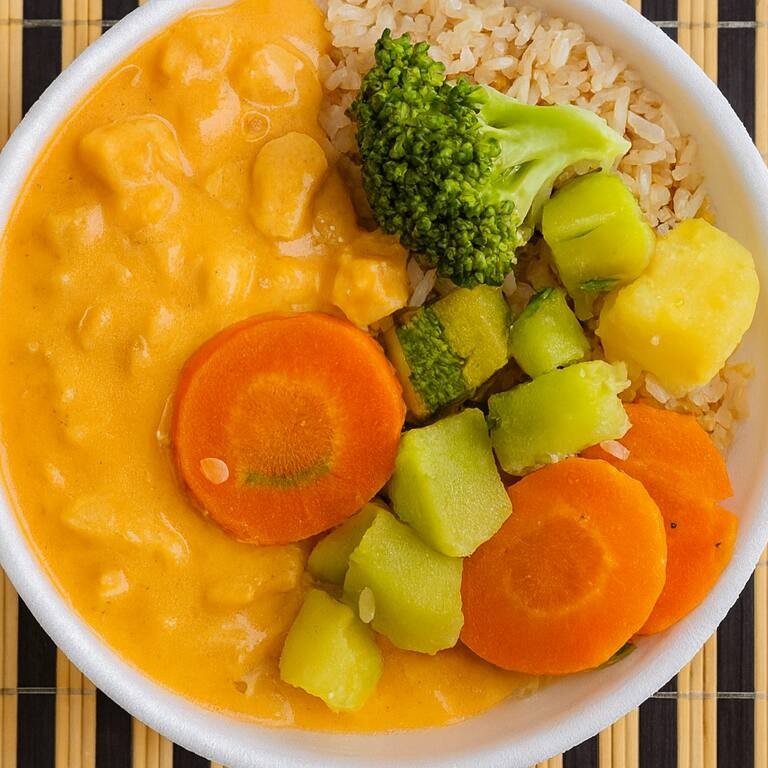 Clássico e delicioso! Strogonoff de Frango no molho cremoso, acompanhado de arroz integral, legumes coloridos e salada refrescante.