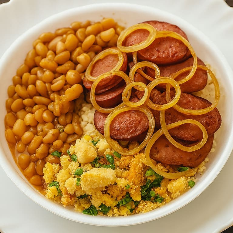 Delicie-se com calabresa acebolada, arroz, feijão carioca e farofa crocante. Um prato clássico, saboroso e cheio de autenticidade brasileira!