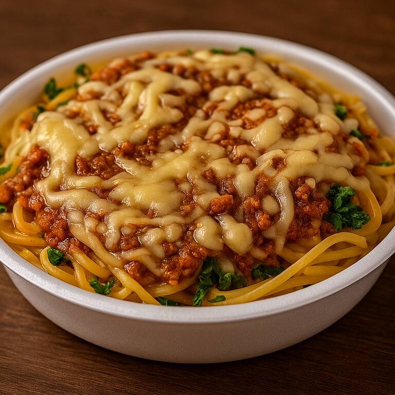 Espaguete al dente com molho bolonhesa suculento e mussarela derretida. Sabor e cremosidade na medida certa, por um preço que cabe no bolso!