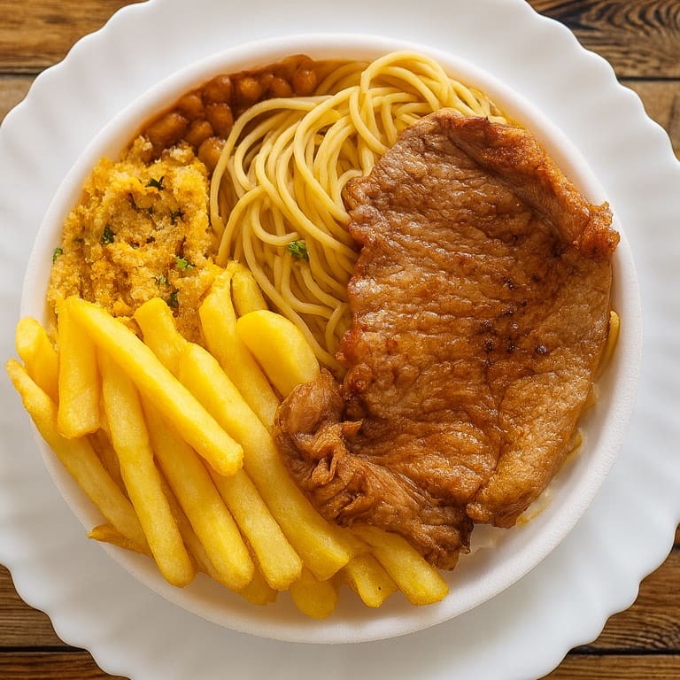 Delicie-se com nosso bife suculento, arroz soltinho, feijão temperado, macarrão al dente, farofa crocante, batatas fritas douradas e salada fresca. Uma refeição completa e irresistível!