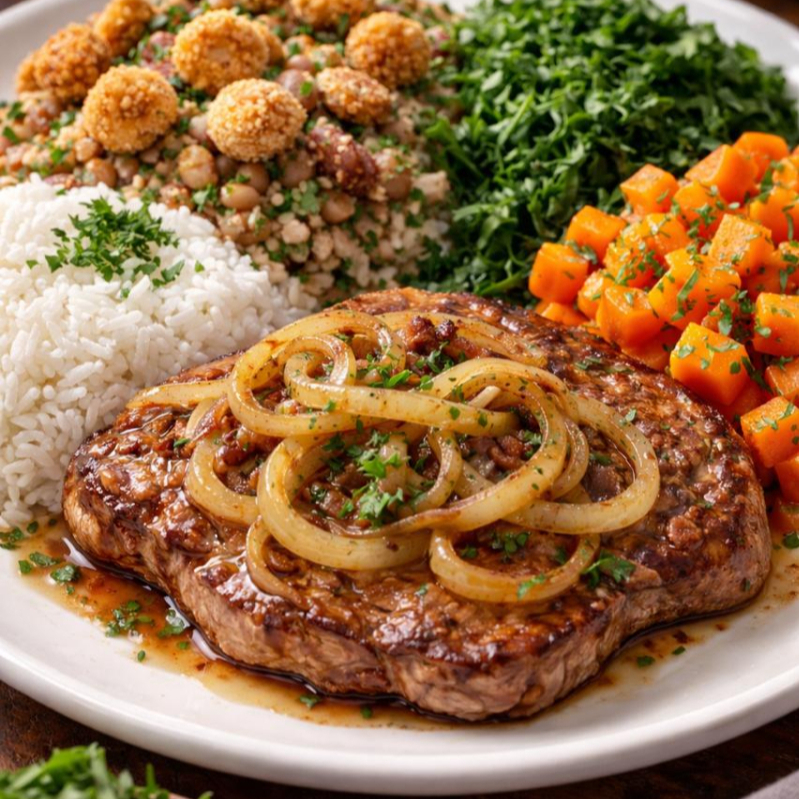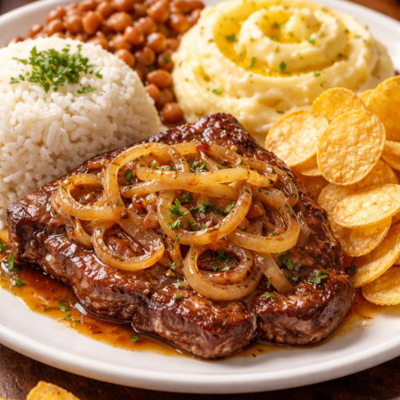 DELICIOSO BIFE DE BOI GRELHADO E BEM MACIO COM CEBOLAS, ACOMPANHADO DE ARROZ SOLTINHO, FEIJÃO REFOGADO COM ALHO E SAL, PURÊ DE BATATA E FRITAS CHIPS.