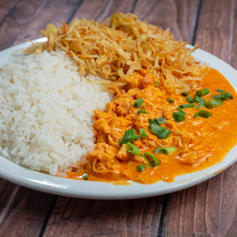 DELICIOSO STROGONOFF PREPARADO COM FILÉ DE FRANGO EM CUBOS AO MOLHO DE TOMATE, FINALIZADO COM CREME DE LEITE. ACOMPANHA ARROZ, BATATA PALHA E CHEIRO VERDE