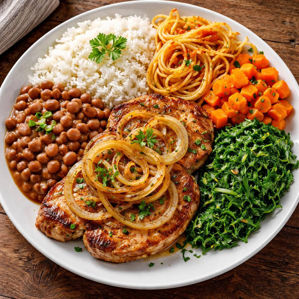 DELICIOSO E SUCULENTO BIFE DE PORCO ACEBOLADO, ARROZ, FEIJÃO, MACARRÃO, SALADAS FRESQUINHAS DE COUVE E CENOURA.