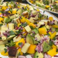 Arroz comum, feijão comum, saladas diversas, farofa e macarrão