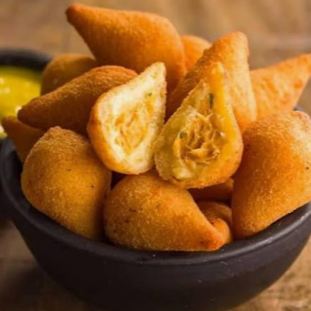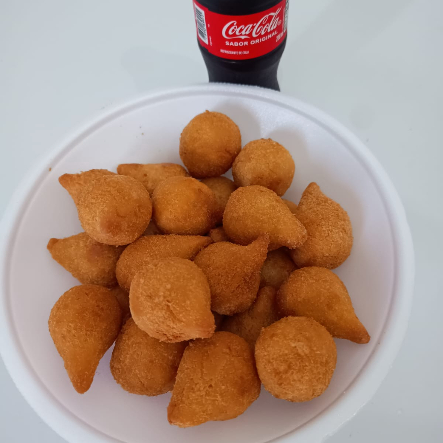 Deliciosas mini coxinhas de frango, feitas com massa macia, recheio bem temperado e fritas na hora, garantindo crocância por fora e sabor por dentro. Aproximadamente 20 gramas cada unidades