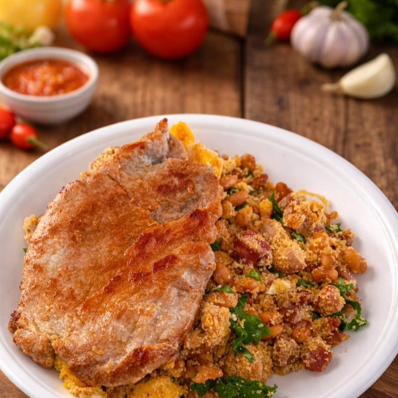 Arroz, Tropeiro, Macarrão, bife de Porco e salada do dia.