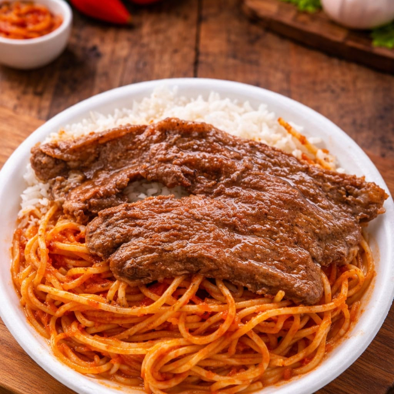 Arroz, Feijão, Bife de Boi, ovo, Macarrão e Salada do dia.