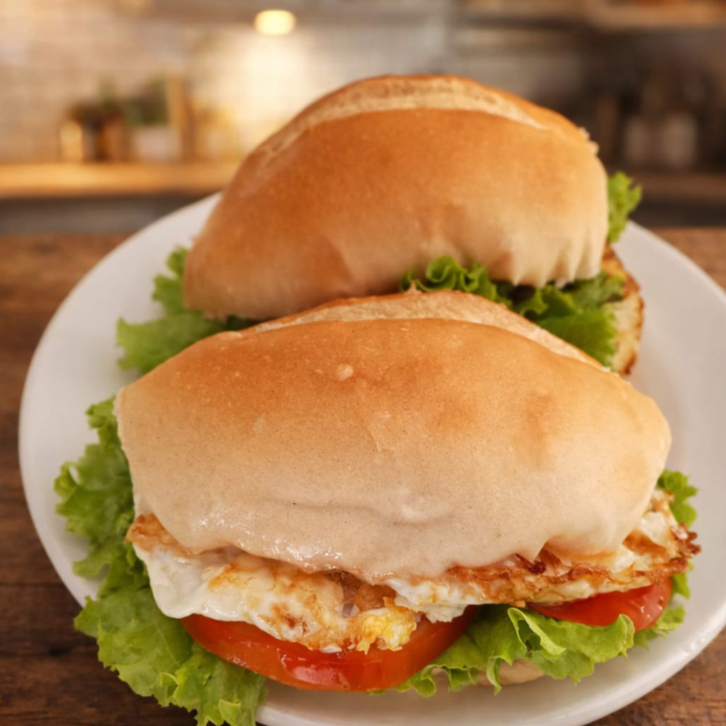 Pão francês crocante com ovo, alface fresca e tomate. Um pão com ovo diferente e delicioso.