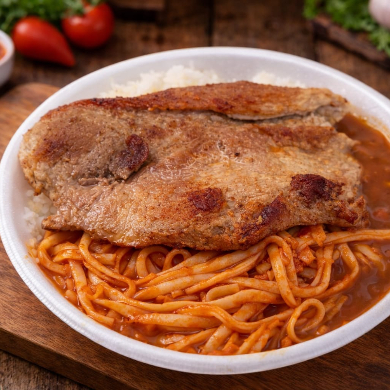 Arroz, Feijao, Macarrão, bife de porco e salada do dia.