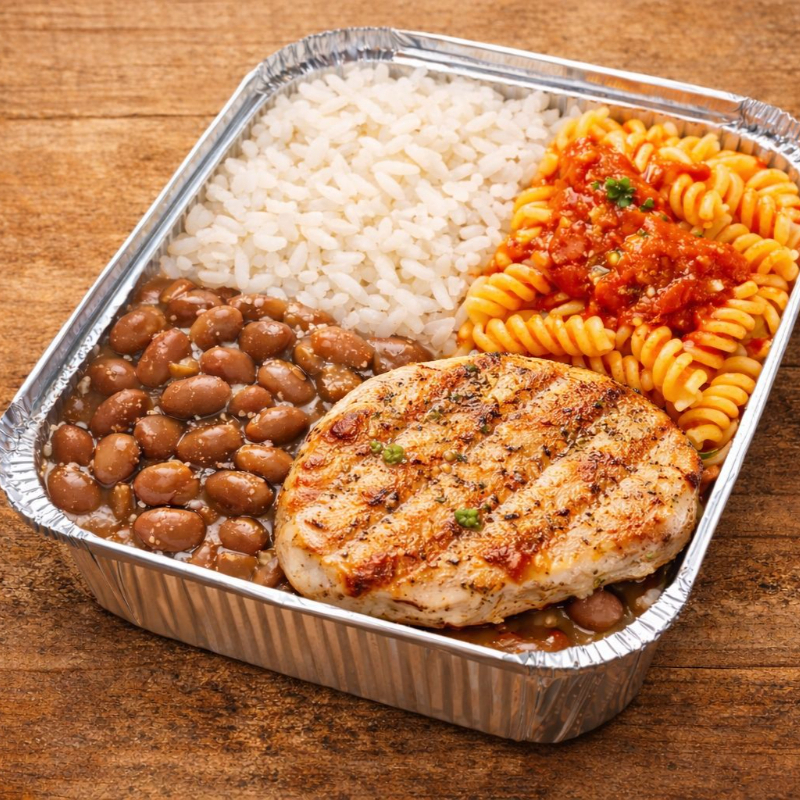 Marmita Pequena- Arroz, feijão, macarrão, bife de frango.