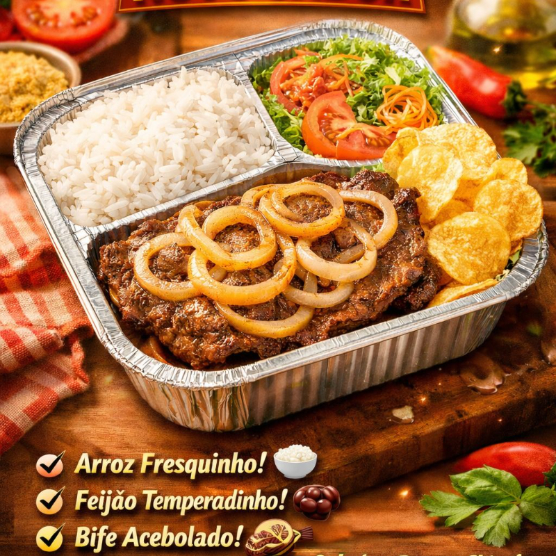 Arroz branco soltinho, feijão, bife de boi grelhado e batata chips frita. Acompanha salada.