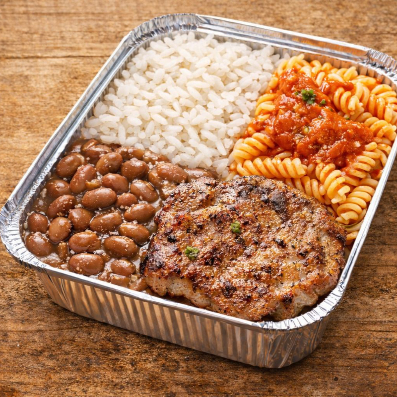 Marmita Pequena - Arroz branco soltinho, feijão, macarrão, bife de pernil acebolado grelhado.