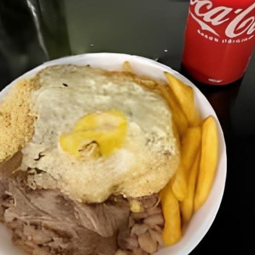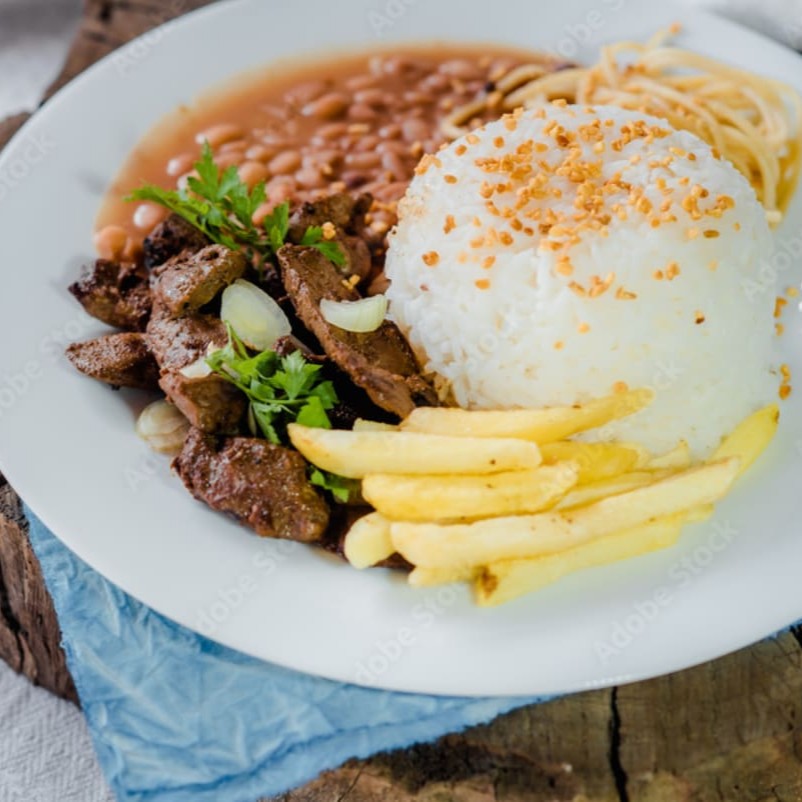 Arroz, Feijão, Macarrão, Batata Frita, Salada, Fígado de Boi.