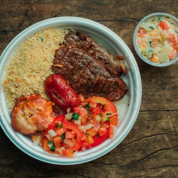 Acompanhamentos Arroz, Feijão Tropeiro, Macarronese, Batata Frita, Salada, Frango Assado.