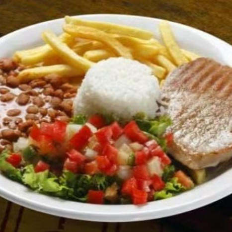 Arroz, Feijão, Macarrão, Batata Frita, Salada, Bife de Porco.
