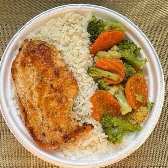 Marmita com delicioso filé de frango grelhado acompanhado de arroz branco, feijão e mix de legumes. Serve 1 pessoa