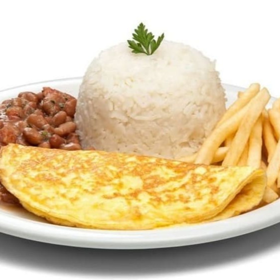 Arroz, Feijão, Macarrão, Batata Frita, Salada, Omelete com Presunto e Mussarela.