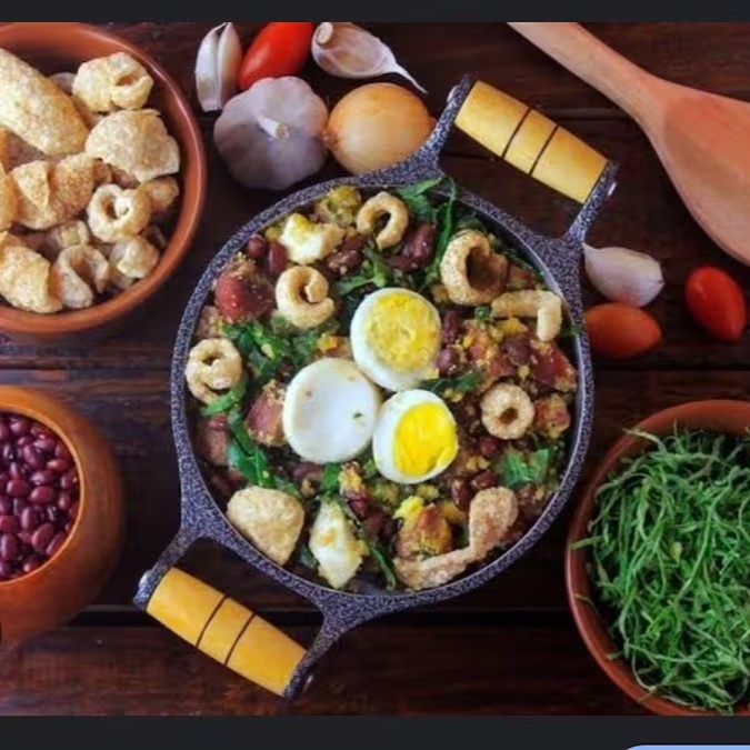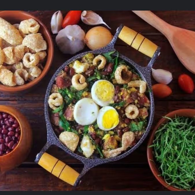 Feijão ,farinha de mandioca, carne porco picado ,calabresa, bacon ,cebola, cebolinha, couve e torresmo.