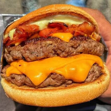 O X-Pitbull Duplo é uma experiência saborosa e robusta. Este hambúrguer é composto por dois suculentos hambúrgueres de 90 gramas cada, cuidadosamente grelhados. Acompanha dois ovos fritos, que trazem uma textura cremosa, e uma generosa camada de queijo mussarela derretido. O sabor é ainda mais enriquecido com fatias de presunto de alta qualidade, bacon crocante e peito de frango desfiado suculento. O toque final fica por conta de uma camada de batata palha crocante, uma salada fresca e leve e um molho especial, que dá ao prato um sabor único e irresistível.