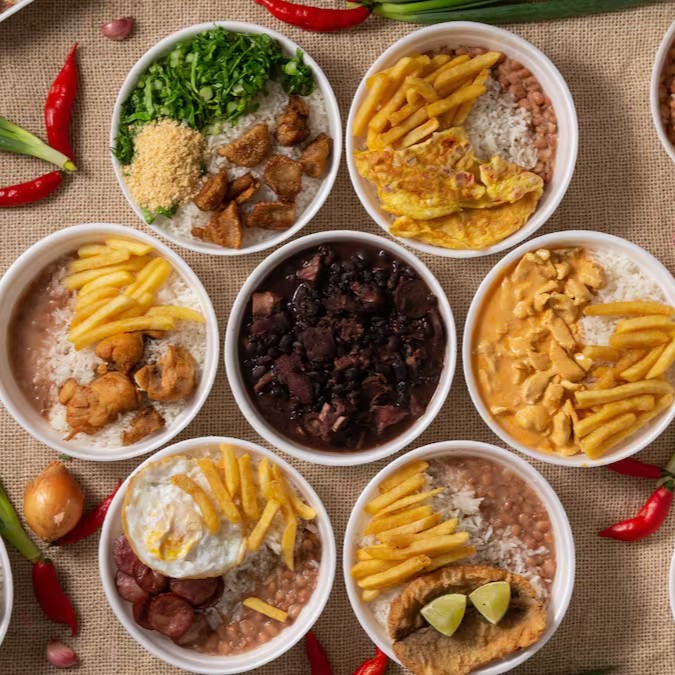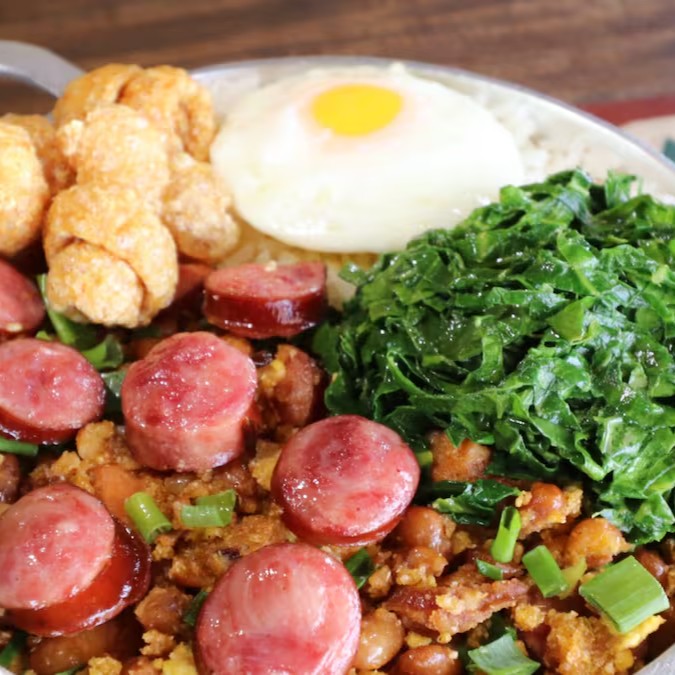 Marmitex grande com tropeiro , arroz , vinagrete , ovo e ( linguiça ou Lombo )