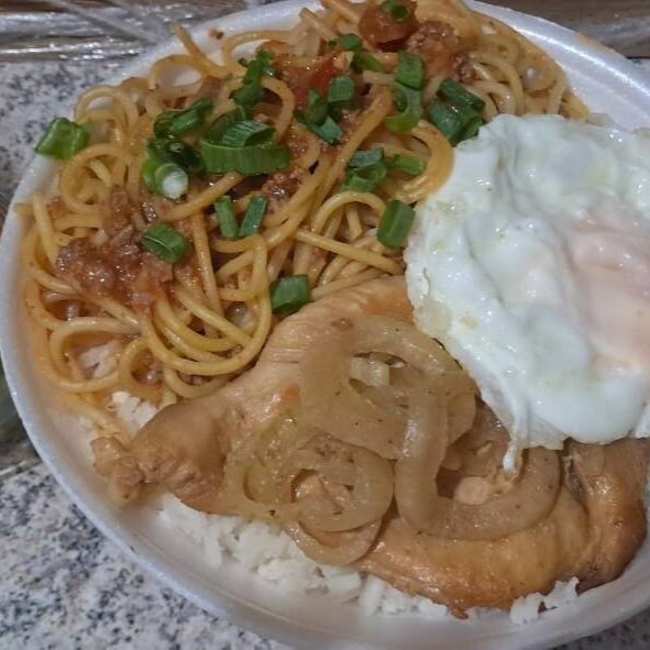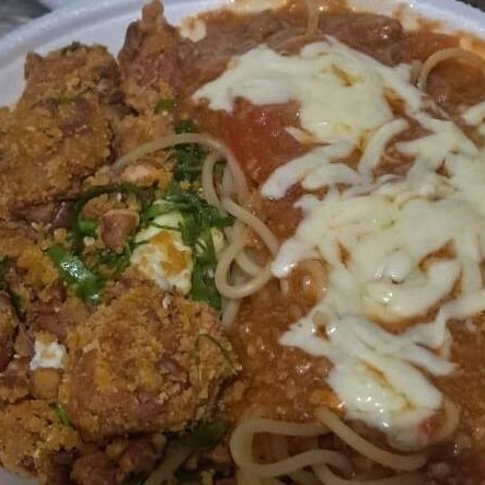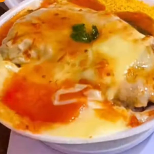 Tropeguete Bem Caprichado com bastante molho-Metade Feijão Tropeiro, Metade Espaguete A Bolonhesa ,Mussarela Ralada Por Cima E Cebolinha