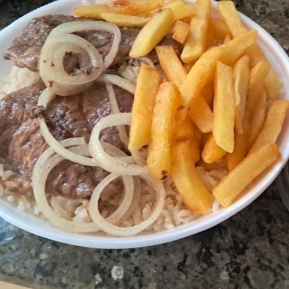 Marmita Bem Caprichada Comida Caseira Com_ Arroz, Feijão, Bife De Boi Acebolado, Fritas E Salada.