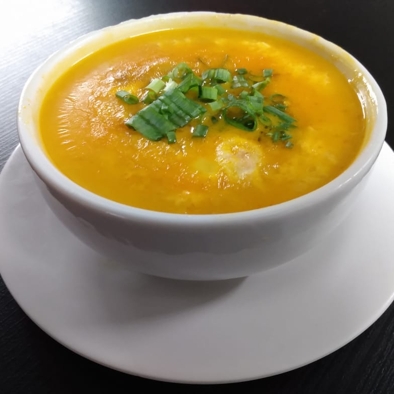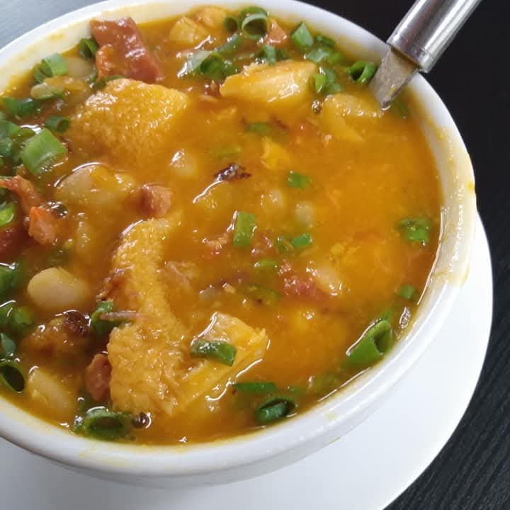 CALDO DE MANDIOCA COM CARNE COZIDA,ACOMPANHA TORRESMO E CEBOLINHA