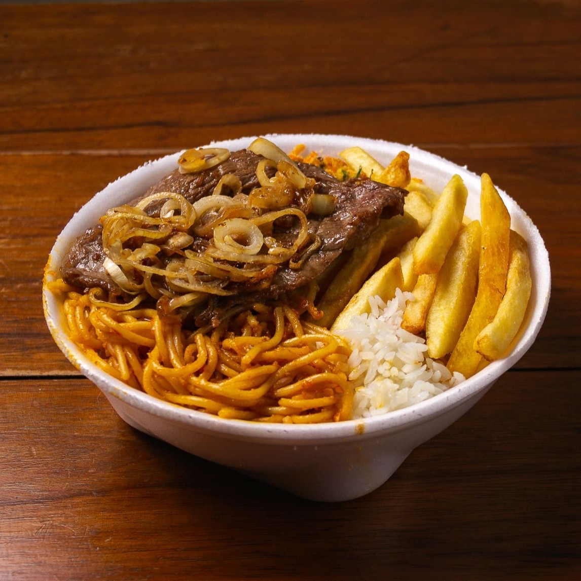 Arroz, feijão, macarrão, farofa de cenoura, batata frita e carne de boi cozida