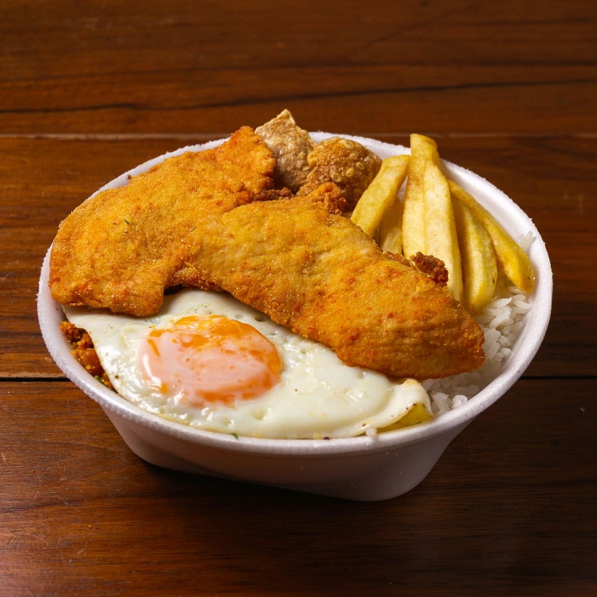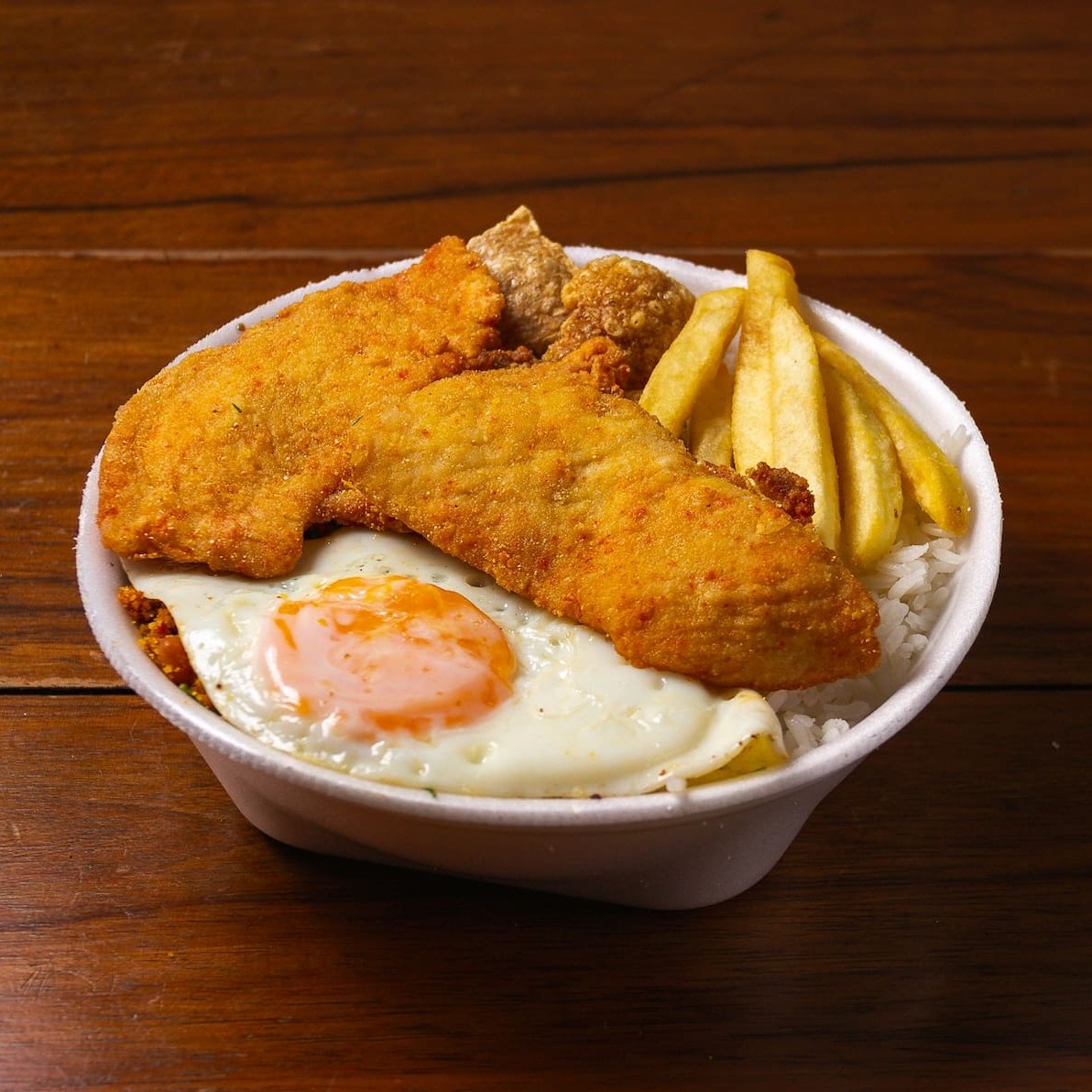 Arroz, feijão, file de frango, molho tomate, queijo e batata frita