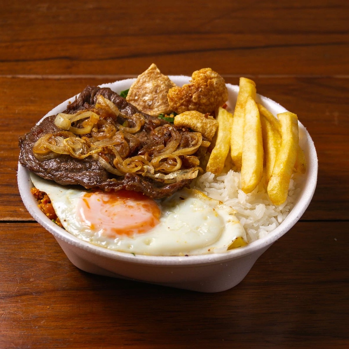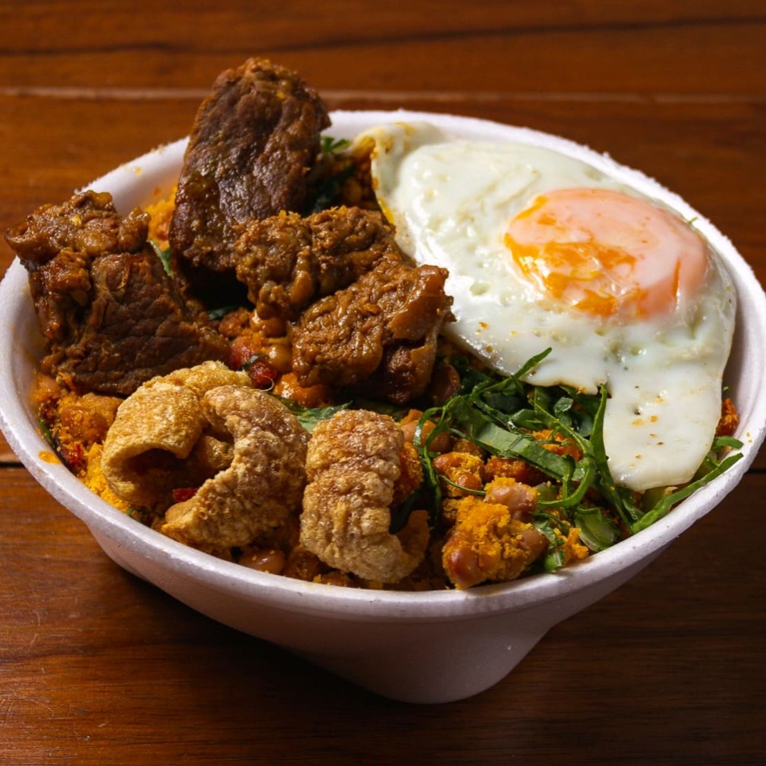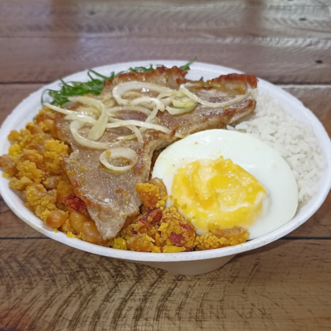 Arroz, tropeiro, ovo, torresmo e bife de boi