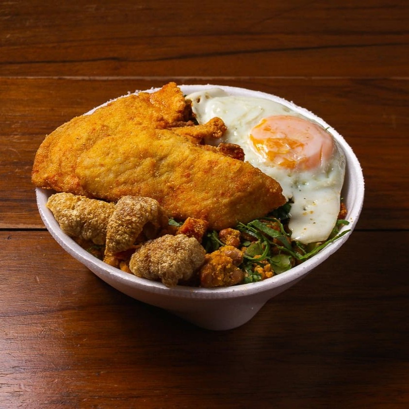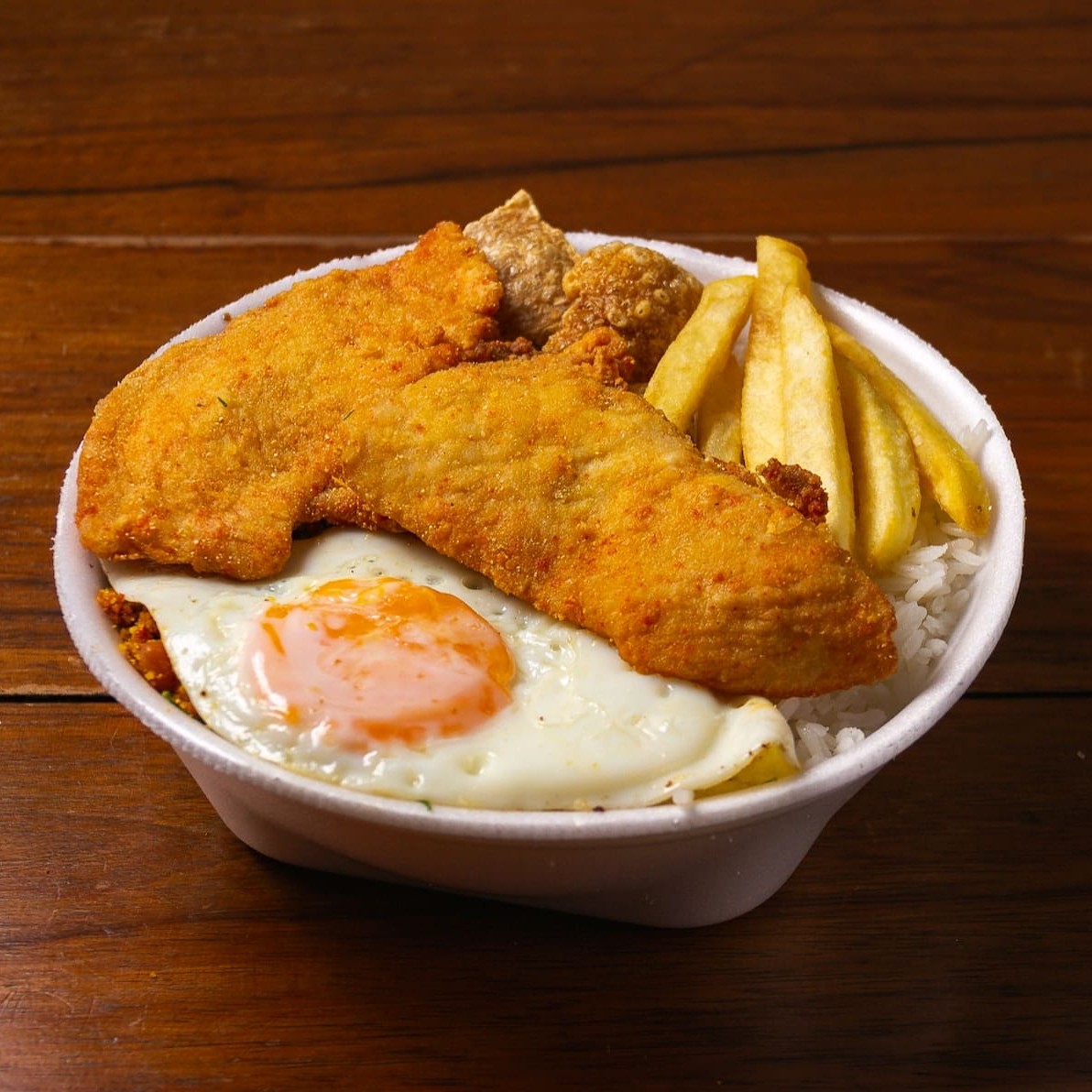 Tropeiro, arroz, ovo, torresmo e filé de frango empanado.