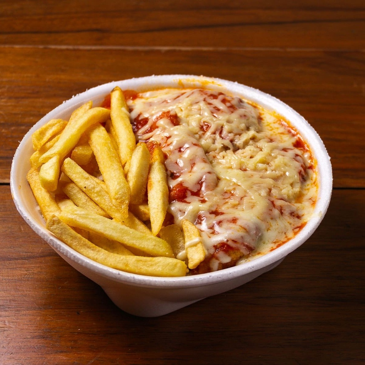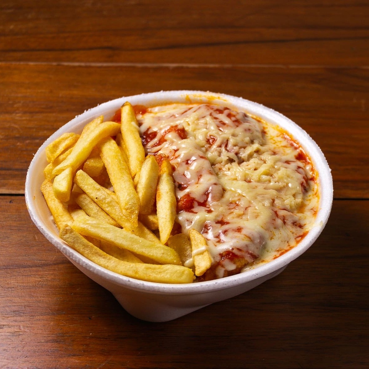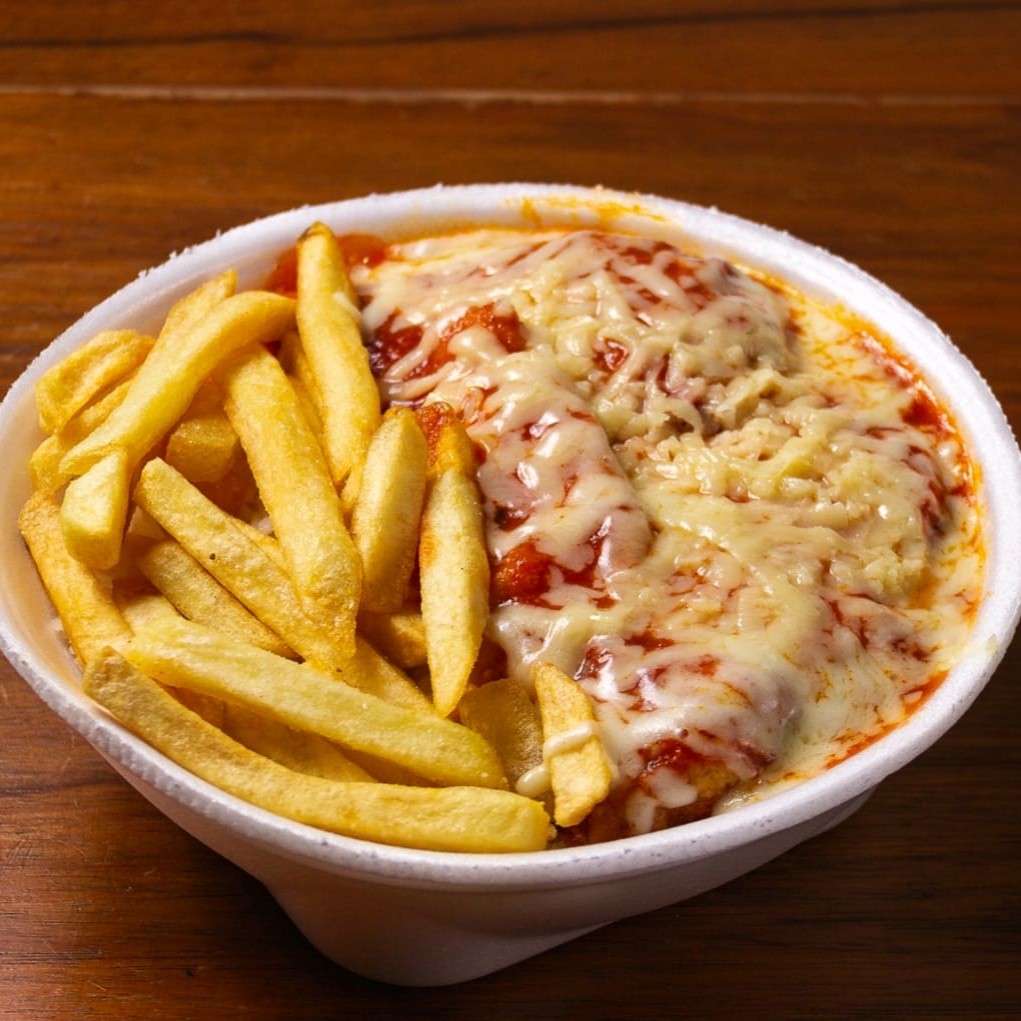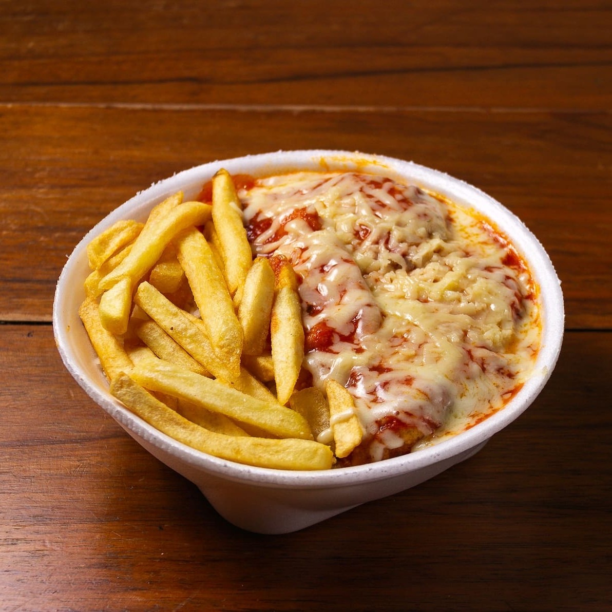 Arroz,Feijão,Parmegiana de Frango com Molho de Tomate,Queijo e Batata Frita