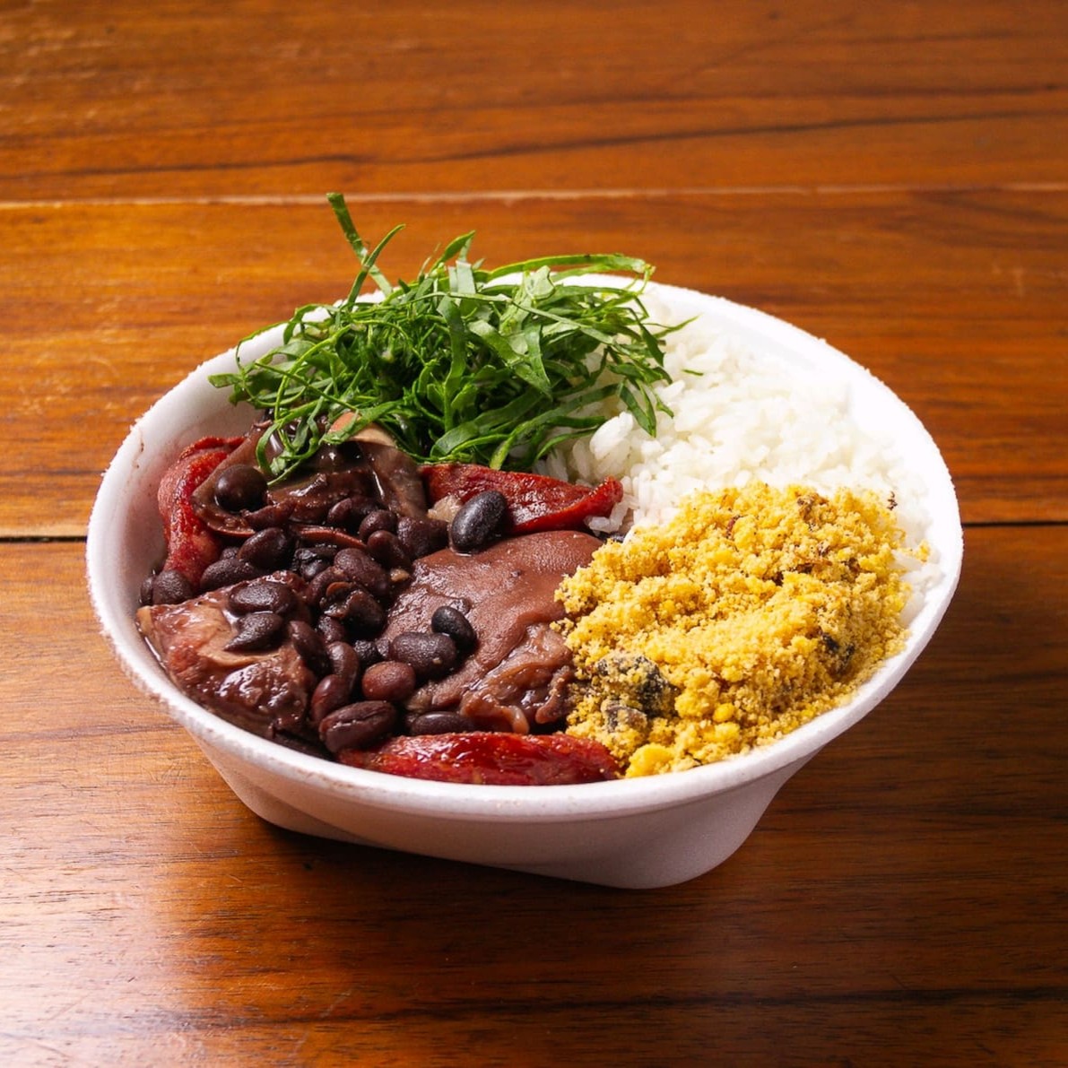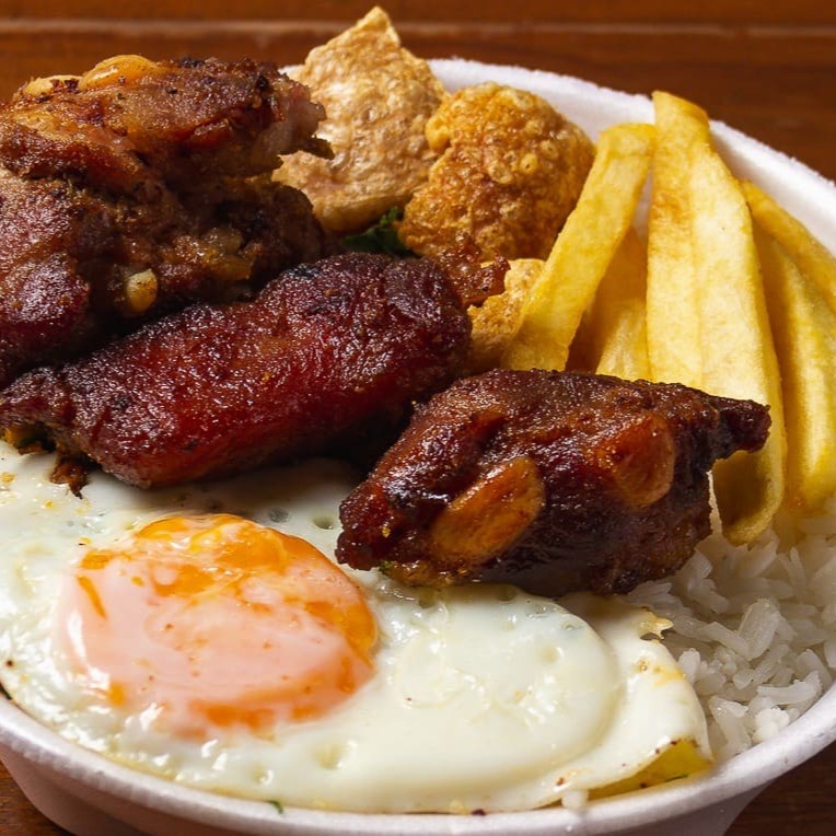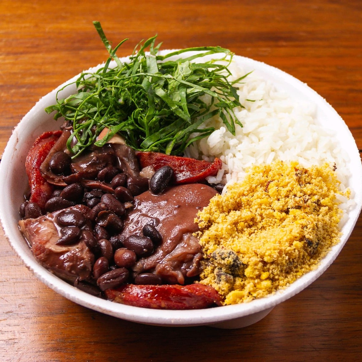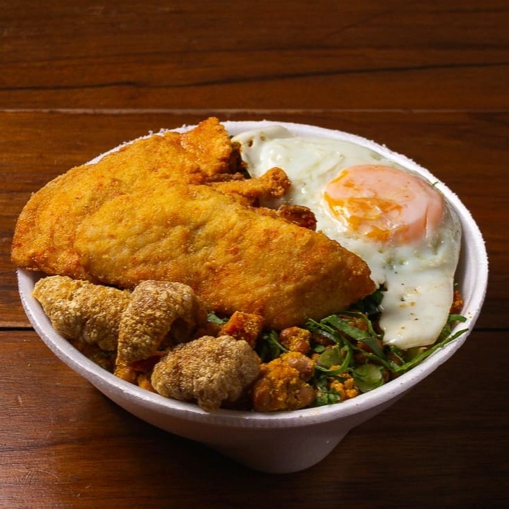 Arroz, tropeiro, ovo, torresmo e linguiça caseira frita