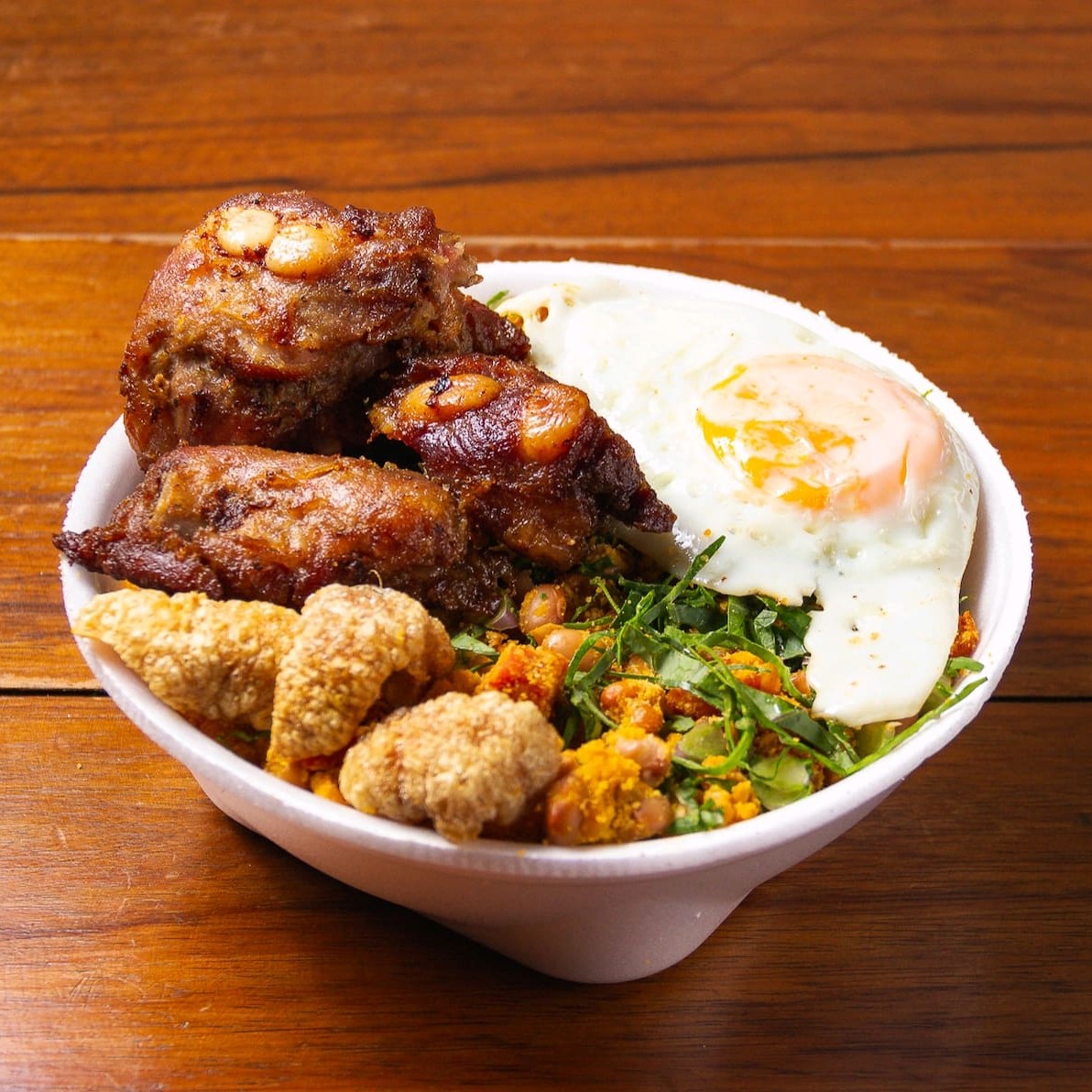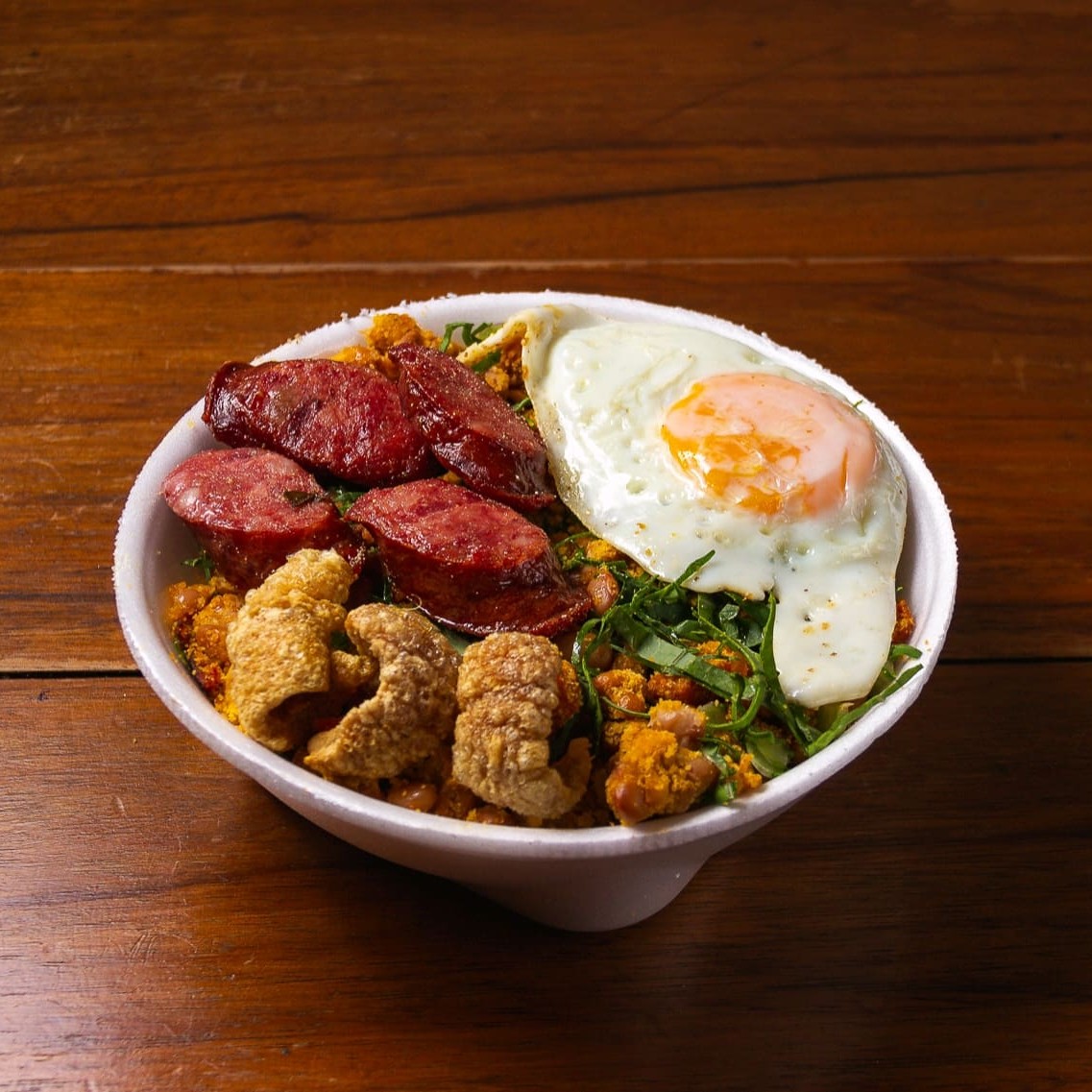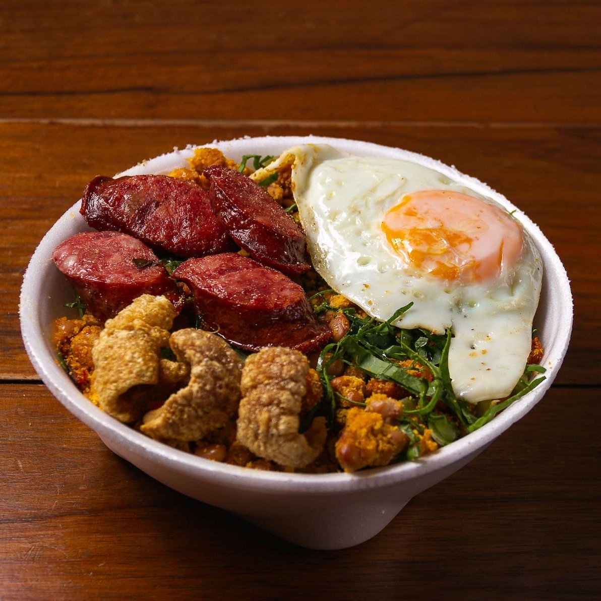 Arroz, tropeiro, ovo, torresmo e linguiça de porco defumada.