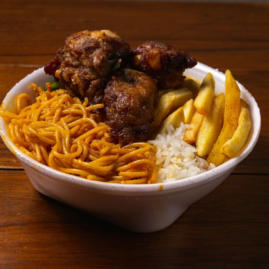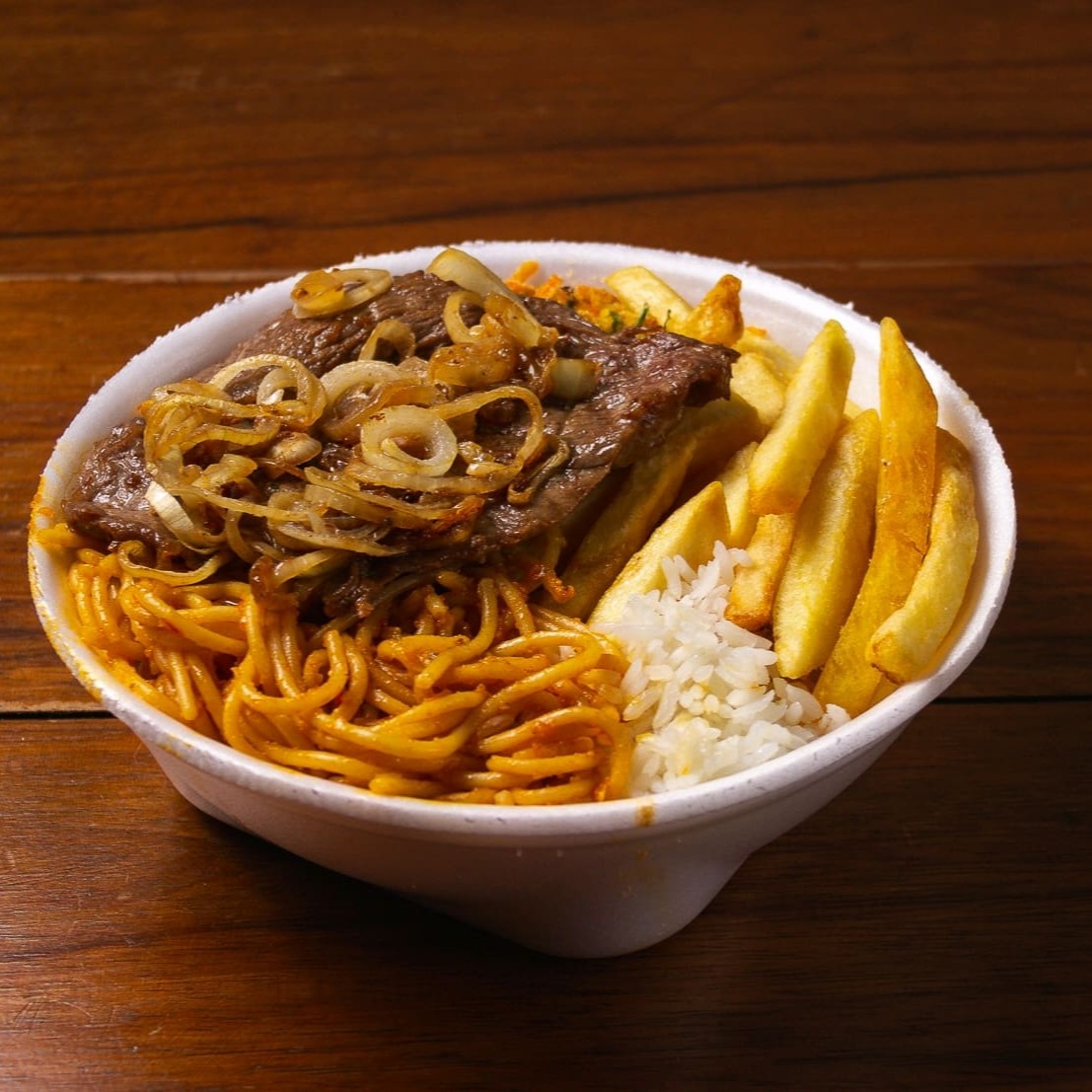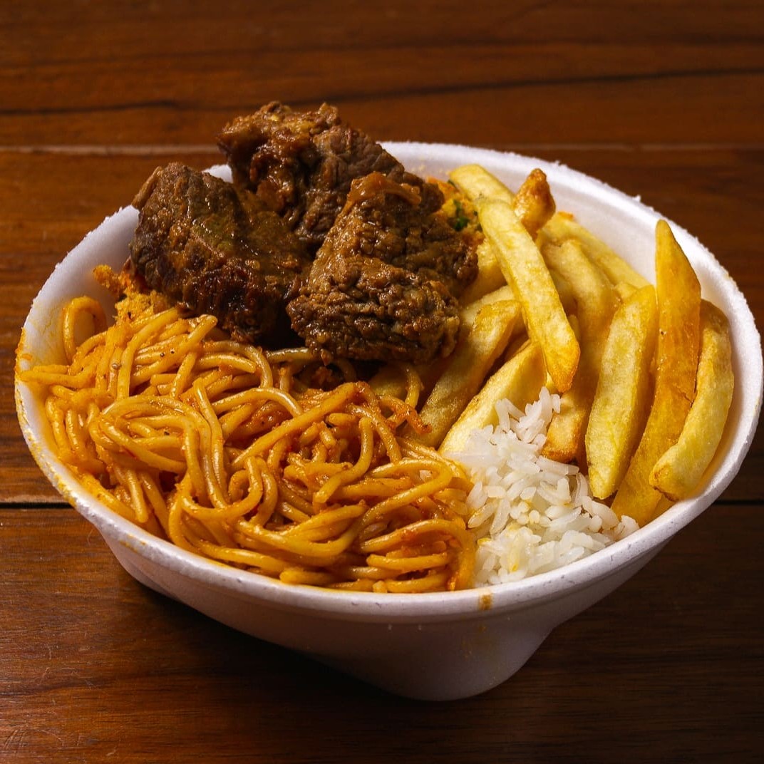 Marmita : Arroz branco, feijão de caldo, macarrão espaguete, farofa de cenoura, batata frita e churrasco misto.