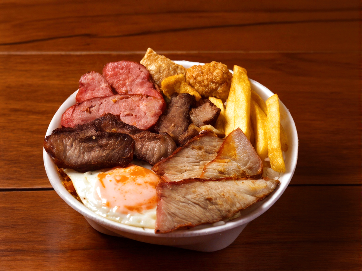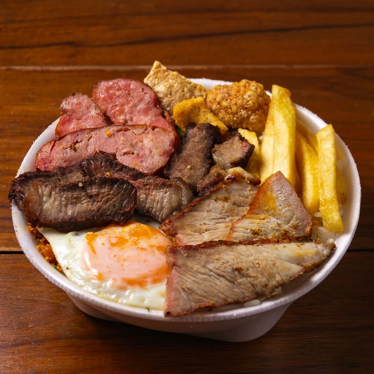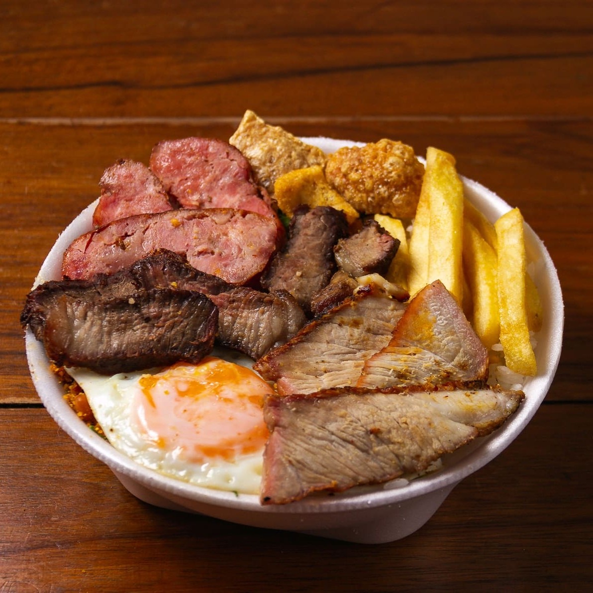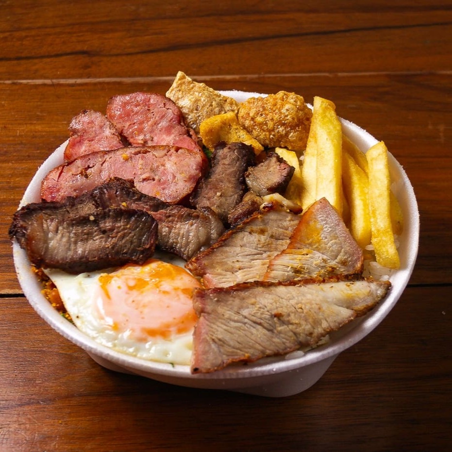 Arroz, tropeiro, ovo, torresmo e churrasco misto