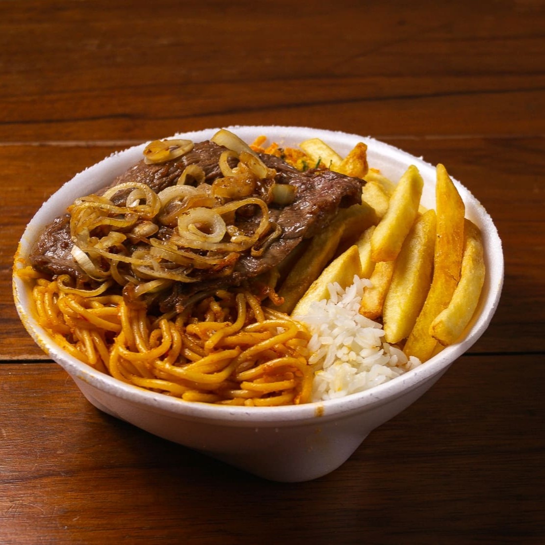 Arroz, feijão, batata fita, farofa de cenoura, macarrão bife de boi