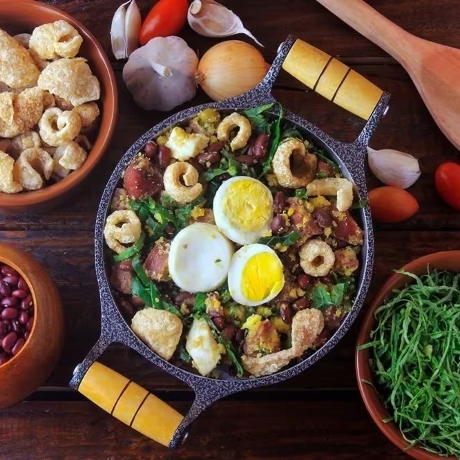 Nosso delicioso tropeiro é composto de: Feijão carioca, linguiça calabresa defumada, bacon, pernil, torresmo, couve e ovo.