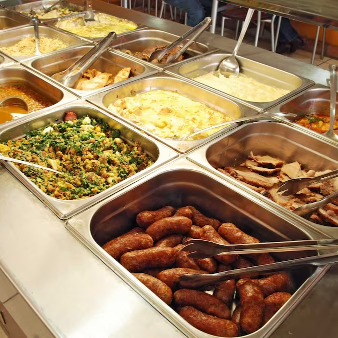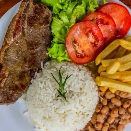 Arroz, feijão carioca, bife de boi, espaguete, batata frita, farofa e salada.