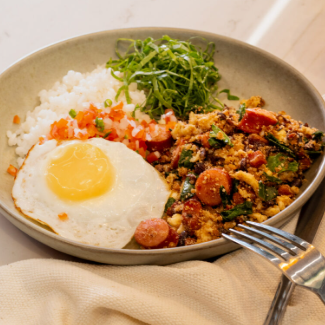 Acompanhamentos: arroz branco e 2 ovos fritos.