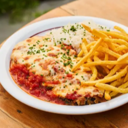 Desfrute de uma deliciosa e suculenta 'Parmegiana com Fritas', diretamente do nosso cardápio 'Marmitex'. Este prato é composto por um arroz branco leve e soltinho, um generoso filé de frango empanado coberto com um irresistível molho à parmegiana de produção artesanal, finalizado com o toque crocante das batatas fritas douradas. Uma combinação perfeita para agradar seu paladar, surpreender seus sentidos e satisfazer sua fome.