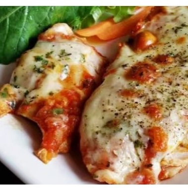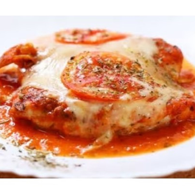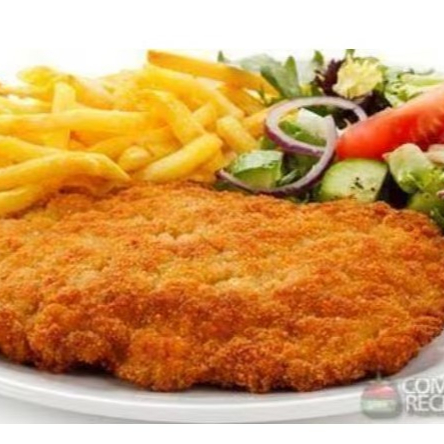 Marmita de 500 ml,bife frango empanado frito,coberto com molho de tomate,tomate fresco,queijo e orégano, acompanha arroz, feijão, macarrão alho e óleo, batata frita