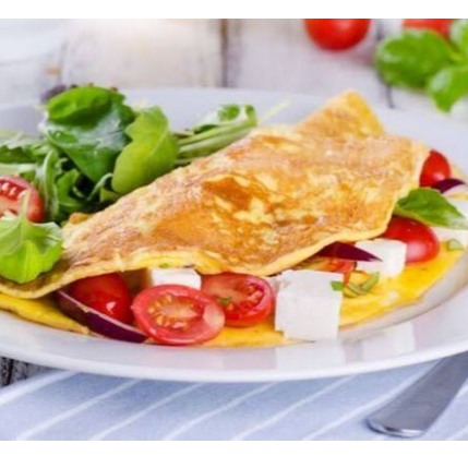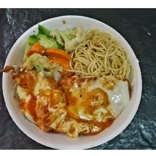 Omelete com queijo tomate orégano, servido com arroz, feijão macarrão alho e óleo batata frita